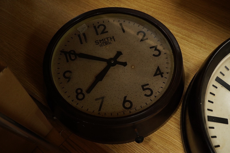 Two bakelite electric wall clocks, Pragotron and Smith Sectric, latter 47cm diam.
