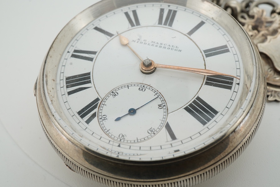Lot 926 , A late Victorian silver open faced keywind pocket watch, by A.G. Maskell of Middlesborough, case diameter 52mm, on a silver curb link albert, hung with two silver medallions.