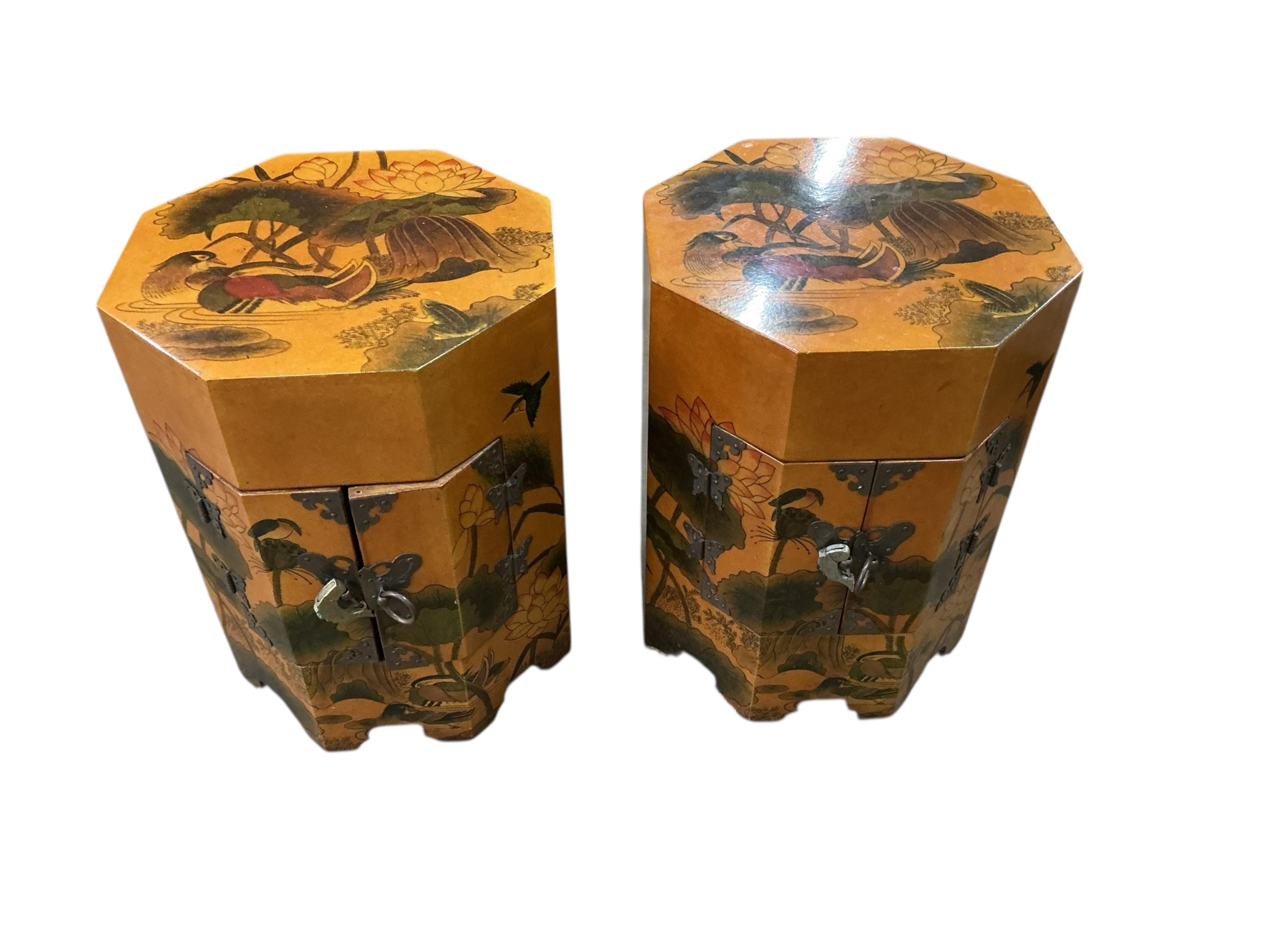 Lot 1402 , A pair of Chinese octagonal lacquer lamp tables, width 33cm, depth 33cm, height 34cm