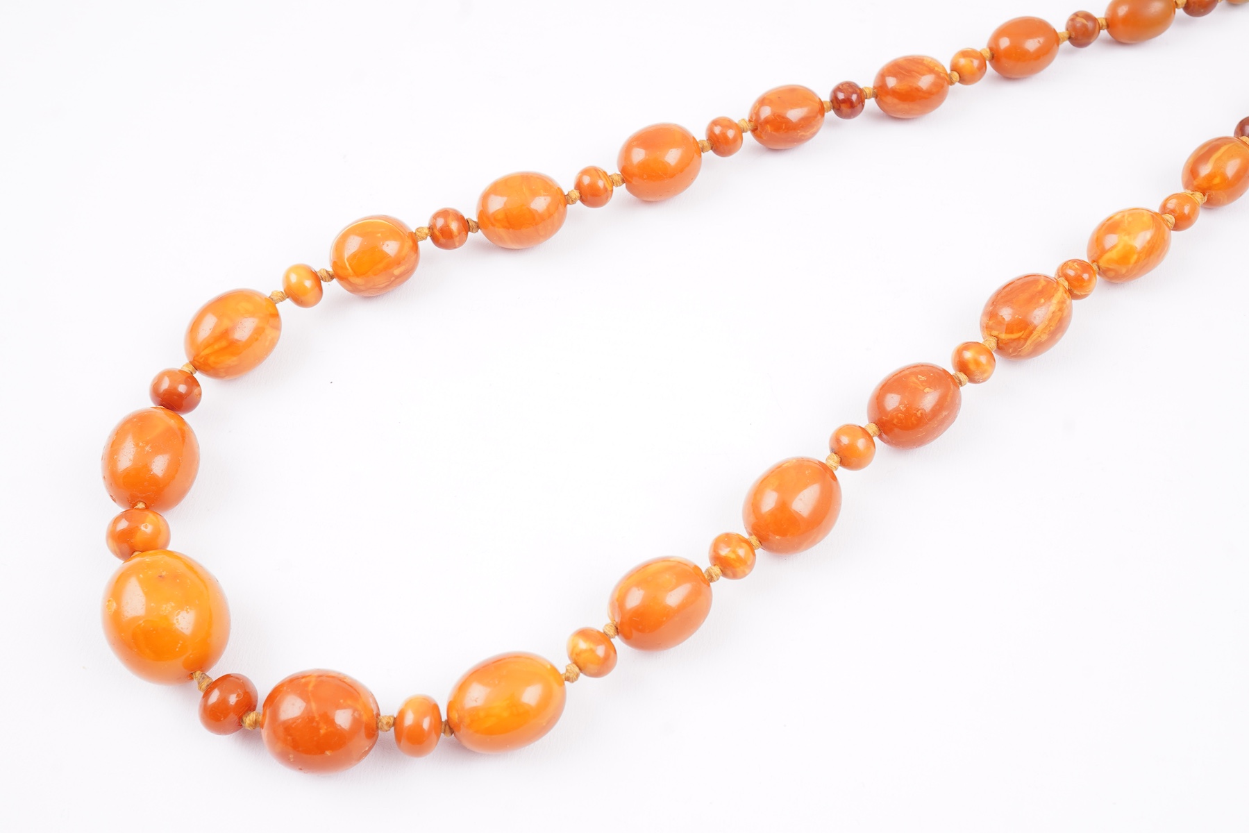 An amber necklace, composed of amber beads measuring approximately 1.5 - 2.5cm, spaced by smaller beads, length 74cm
