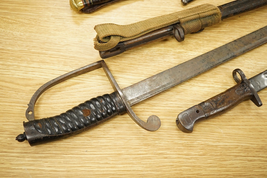 A Pritchard-Greener type revolver bayonet, the cross piece stamped patent number 17143-15 in a steel scabbard, together with two 1907 bayonets, one in its scabbard, plus a late 18th century cavalry trooper’s sword, the blade struck with crowned ‘GR Drury’ together with an agricultural bill hook and a sheathed knife