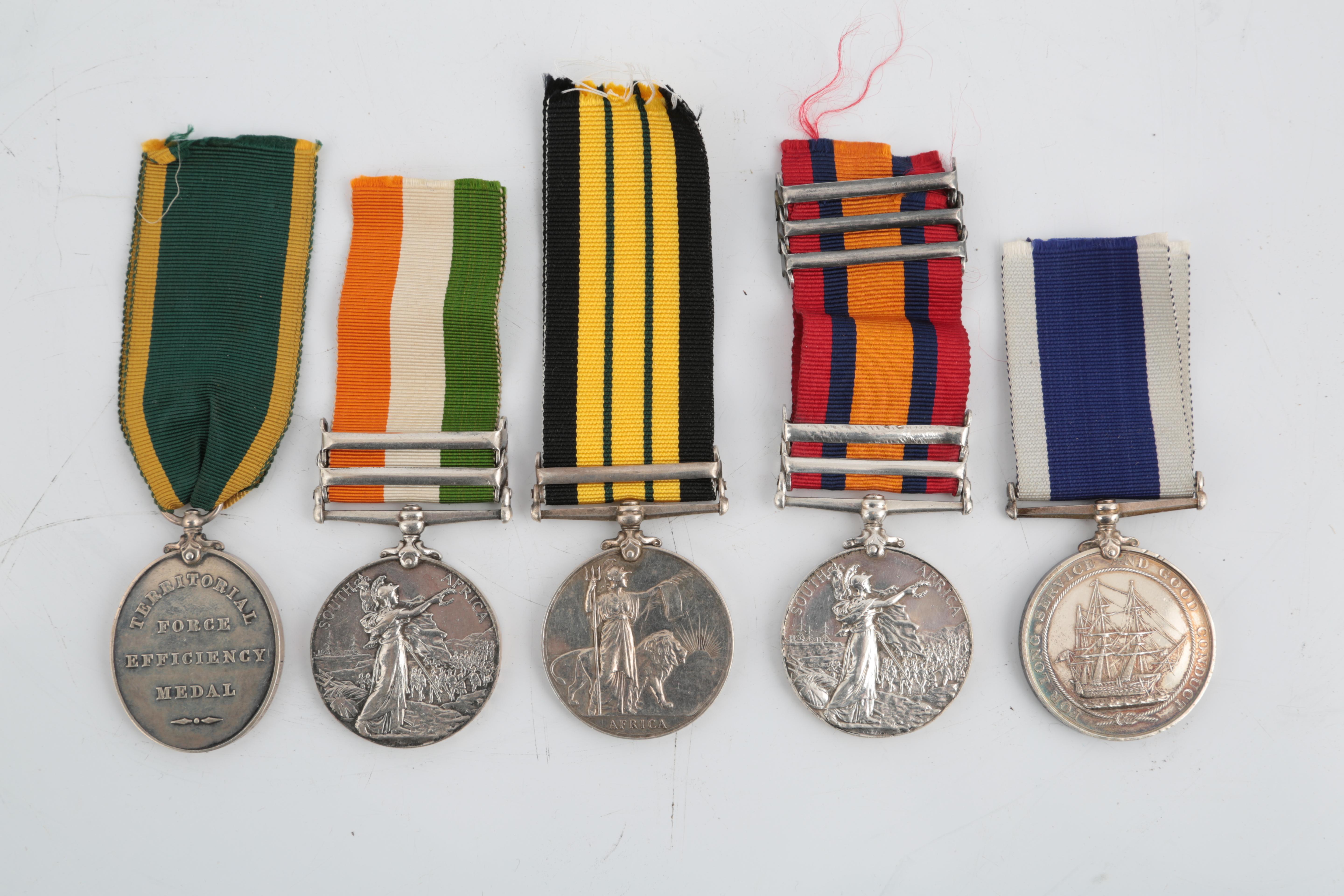 Five Victoria and Edward VII medals; a South Africa medal pair awarded to 83840. GNR. J. Lindsay. R.F.A.; comprising of a Queen’s South Africa medal with clasps for Orange Free State, South Africa 1902, Cape Colony, and Transvaal, and a King’s South Africa medal with clasps for South Africa 1901 and South Africa 1902, (both renamed)