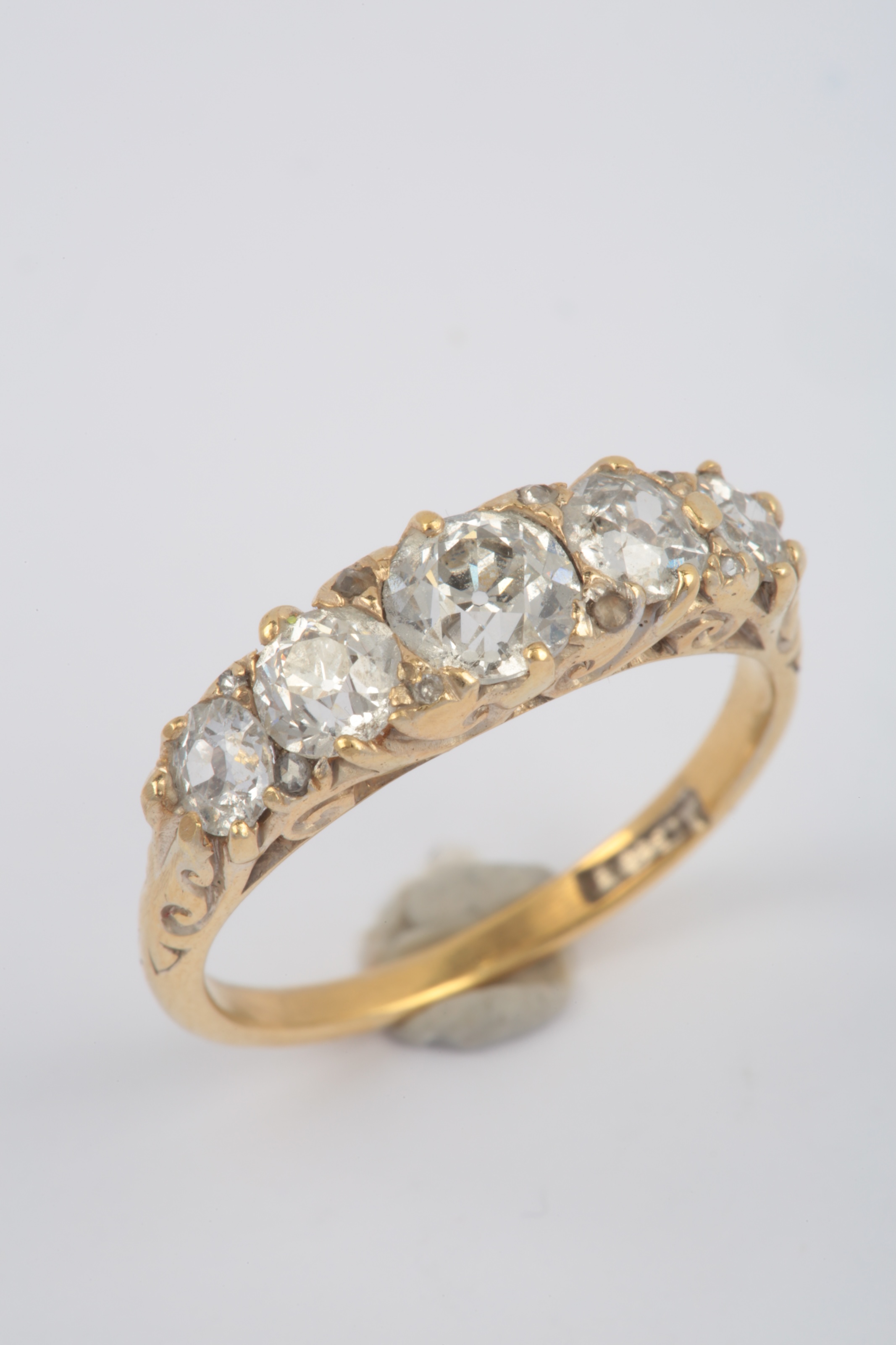 A five-stone diamond ring, early 20th century, set with a sequence of circular-cut diamonds totalling approximately 1.10 carats, accented by rose-cut diamonds, mounted in gold, size L1/2, stamped 18ct, gross weight approximately 3.5 grams