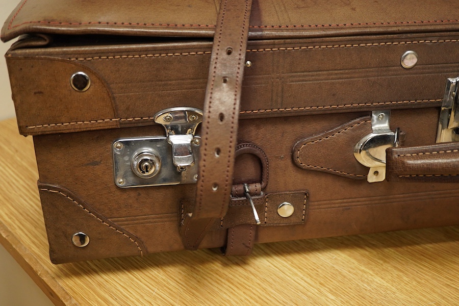 Lot 387 , A graduated set of three leather cases with chrome mounts, labelled Golden leaf, with two keys, largest 76cm wide