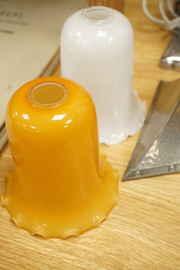 Lot 409 , An early 20th century adjustable brass table lamp with weighted base, and two other electric table lamps, two glass shades, tallest 56cm