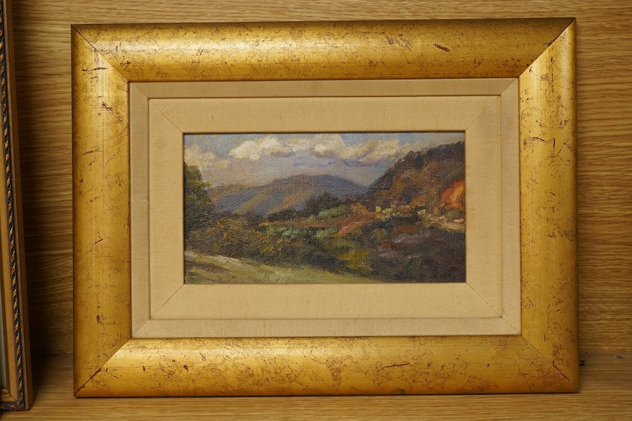 Attributed to Constance Manning, ‘Landscape’, unsigned, details verso to include provenance: ‘Lawsons Sydney Auction 11th April 2000, from the estate of Tempe Manning’, oil on board, 11.5 x 21.5cm