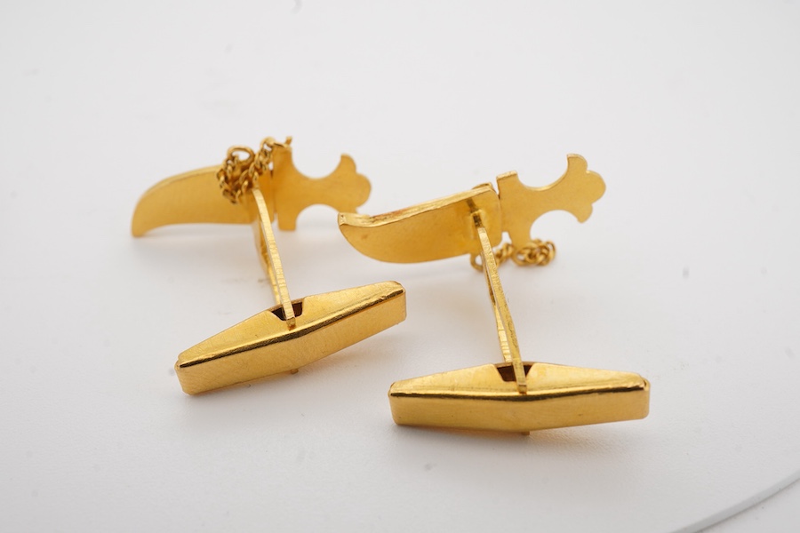 A pair of gold cufflinks, Middle Eastern, each designed as a 'jambiya' dagger in sheath, in gold, length 2.4cm, assay marks, stamped 875, combined gross weight approximately 10.5 grams