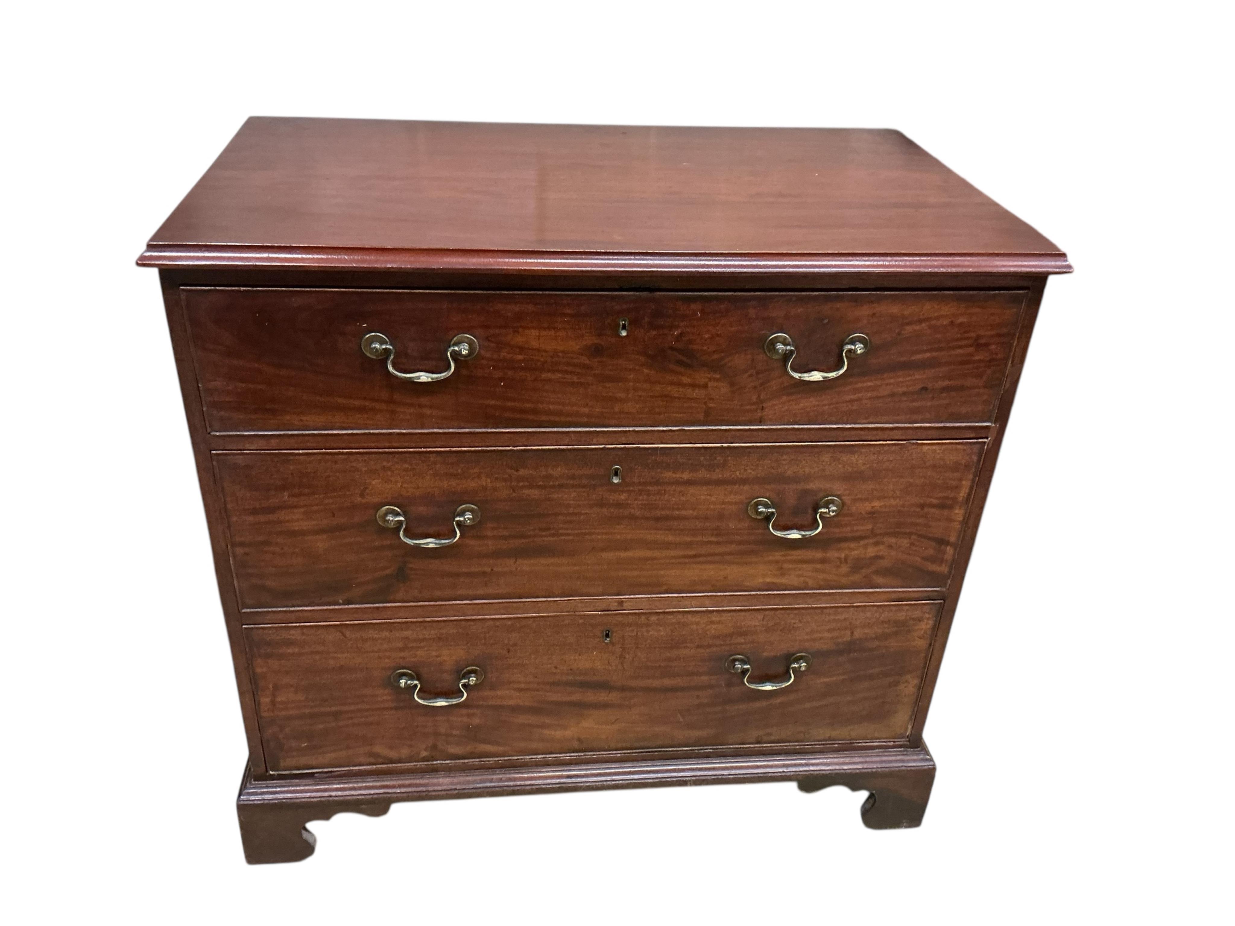 Lot 146 , A George III mahogany chest of three drawers, (restored), width 98cm, depth 57cm, height 90cm