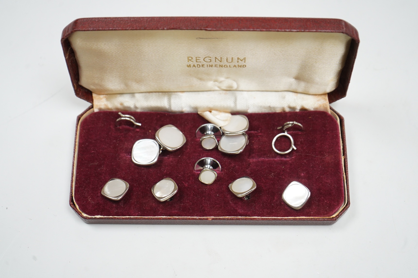 Lot 931 , A cased mother of pearl mounted base metal eight piece dress stud set.