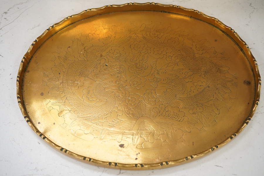 A Chinese engraved brass box, pair of similar candlesticks and an oval tray, and a bronze hand-bell, box 24.5cm wide
