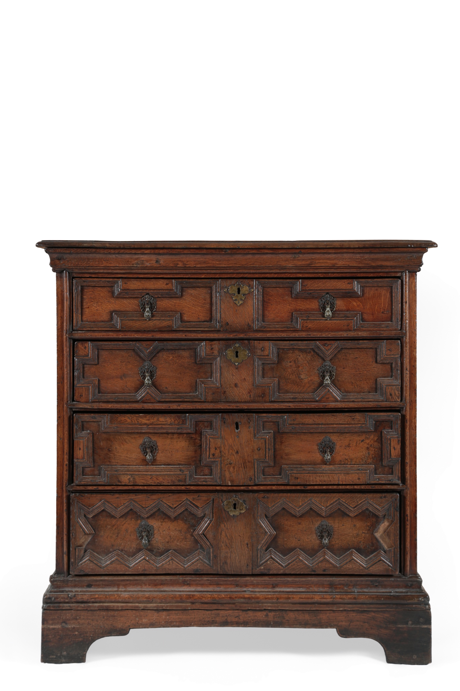 A Charles II geometric moulded oak chest of drawers