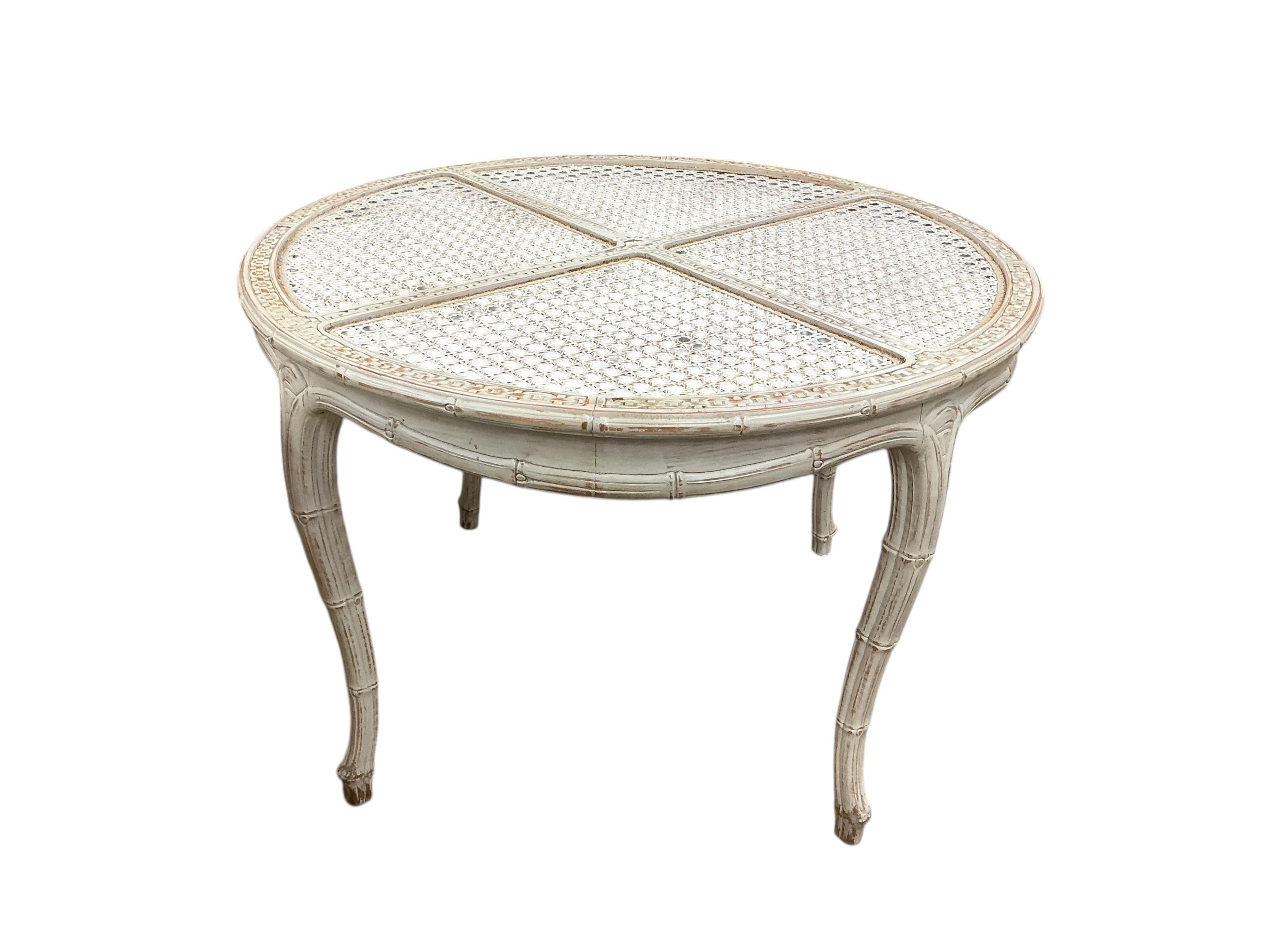 Lot 119 , A reproduction faux bamboo circular caned dining table, diameter 108cm, height 75cm together with four chairs