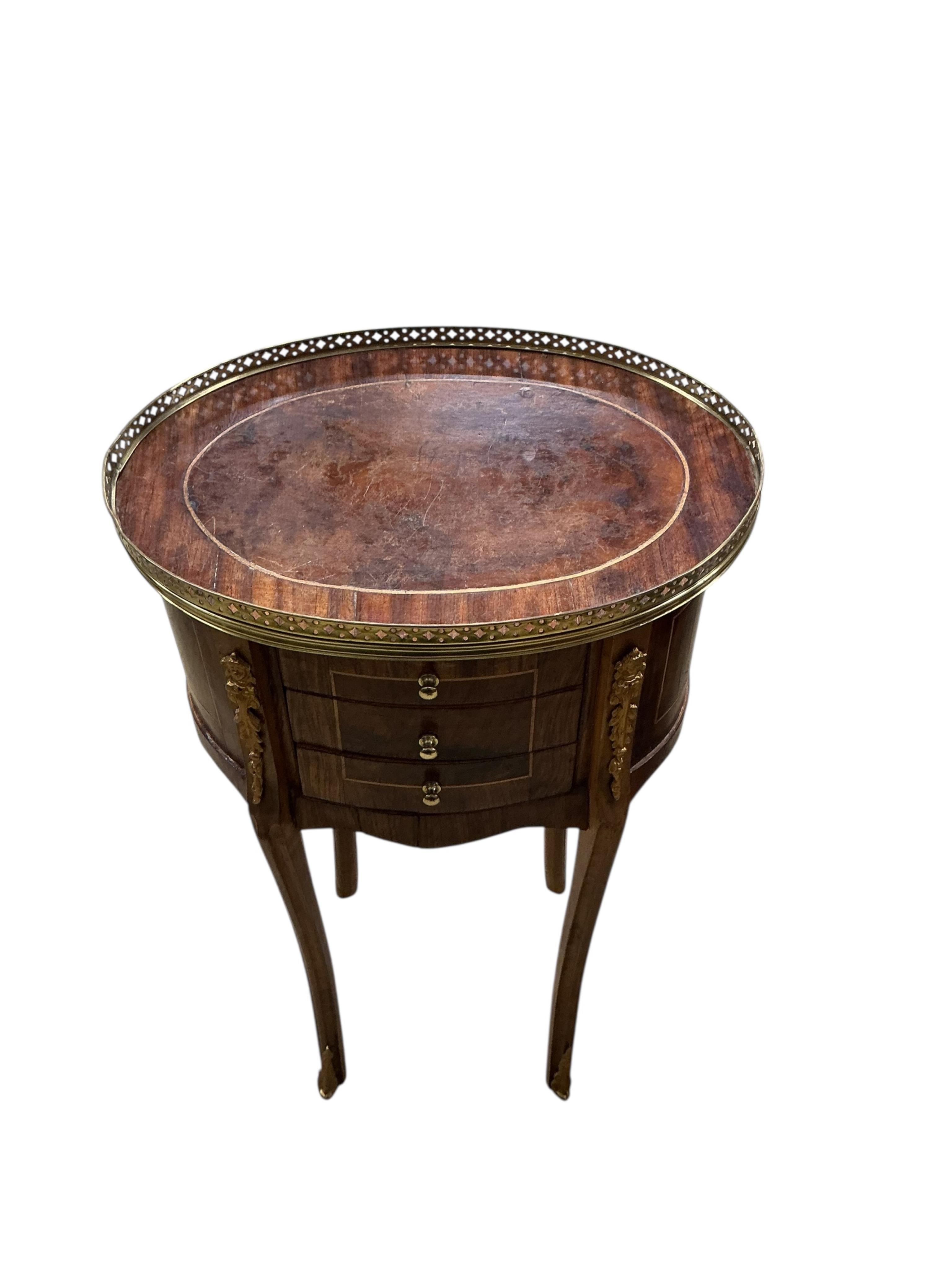A reproduction Louis XVI style oval bedside chest, width 44cm, depth 34cm, height 73cm