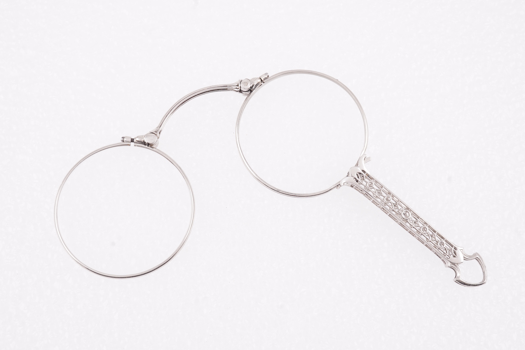 A diamond lorgnette, early 20th century, the spring-loaded lenses mounted in platinum, the openwork handle set with circular-cut diamonds totalling approximately 0.15 carats, length 8.9cm, gross weight approximately 27 grams