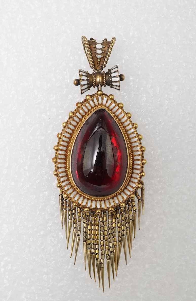 A garnet and enamel locket pendant, mid 19th century, set with a foiled pear-shaped cabochon garnet, to a border and bail decorated with petals of white enamel, the outer edges highlighted with rope twist and grainti decoration, the reverse with a glazed compartment, suspending a fringe of articulated pendants, length 8.8cm, gross weight approximately 23 grams
