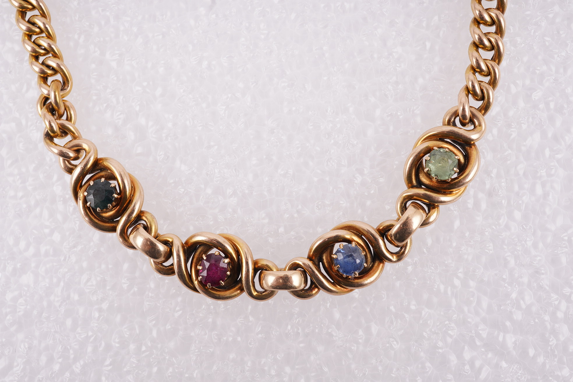 A gold and gem-set bracelet, circa 1900, centring on a section of scrolled links set with a sequence of cushion-shaped rubies, sapphires and a peridot, to a curb link bracelet, mounted in gold, length approximately 18cm, stamped 15, numbered 806, gross weight approximately 12 grams