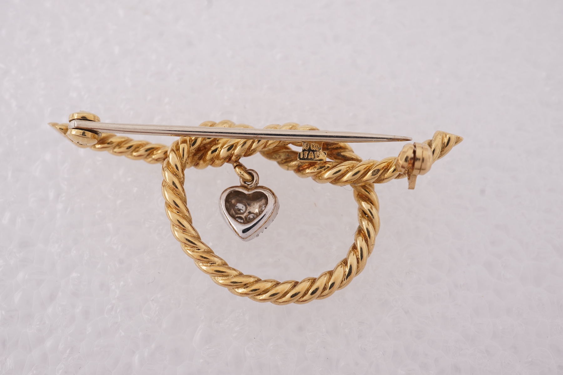 Tiffany & Co., a gold and diamond brooch, designed as knotted rope, suspending a heart-shaped pendant pavé-set with brilliant-cut diamonds totalling approximately 0.12 carats, length 4.6cm, signed Tiffany & Co., 18Kt Italy, gross weight approximately 9.5 grams