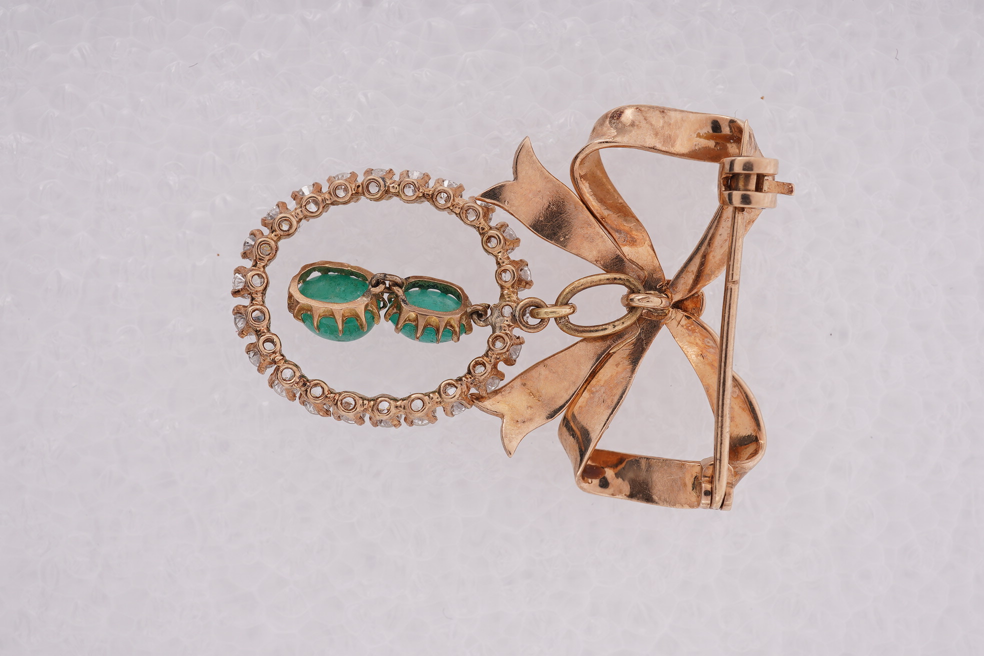 An emerald and diamond brooch, mid 20th century composite, designed as a ribbon bow decorated with foliate scrolled engraving, suspending two cabochon emeralds within a frame of circular-cut diamonds totalling approximately 1.00 carat, mounted in gold, length 3.7cm, gross weight approximately 6 grams