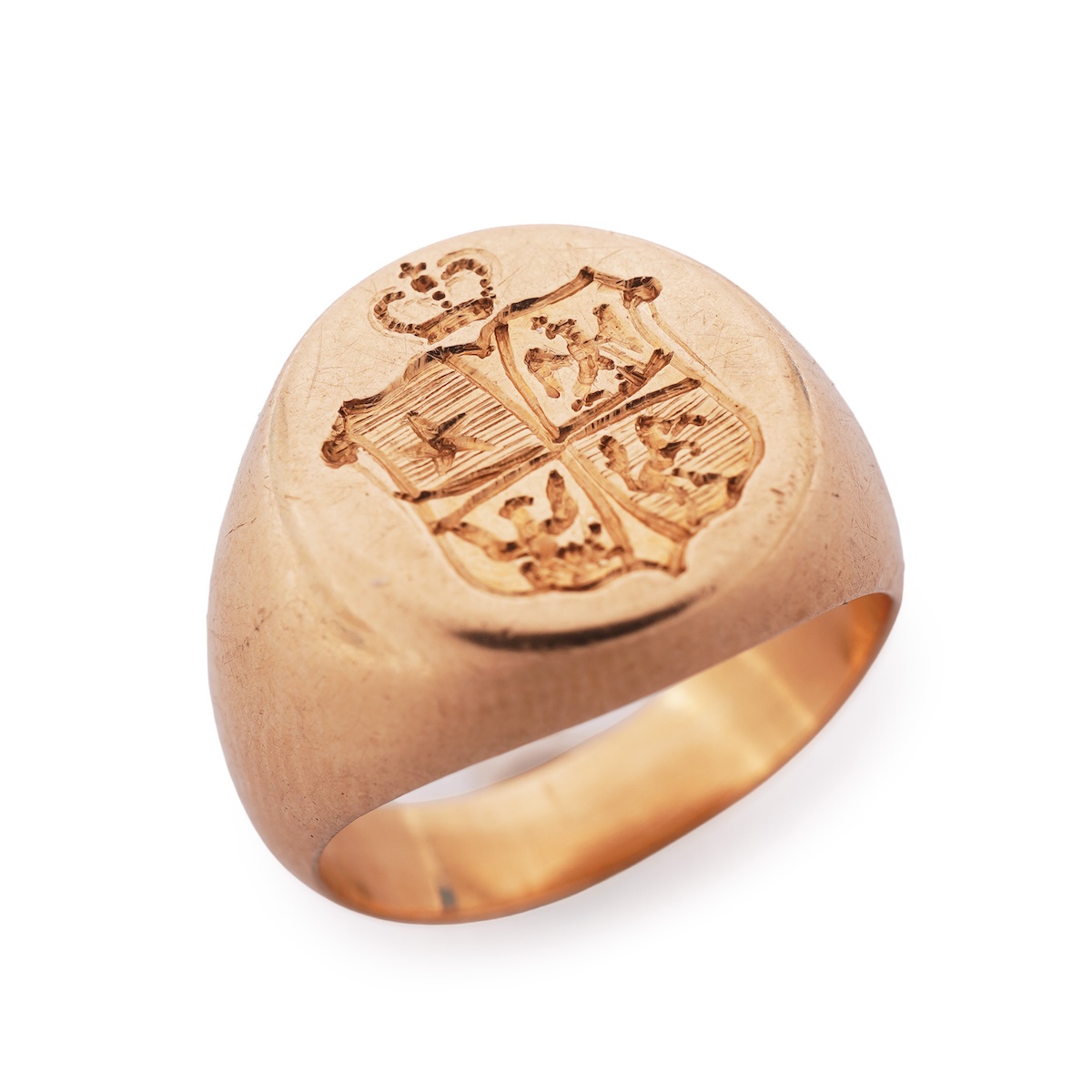 A gold signet ring, the oval matrix engraved with a coat of arms, divided quarterly by a Maltese cross, topped with a crown, in gold, size L, stamped K18, Z.8, gross weight approximately 13.5 grams