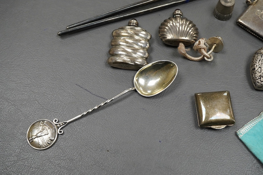 Small collectable silver and white metal items including a Tiffany & Co sterling computer plaque, a metal double spoon measure, a pair of white metal and enamel chopsticks, an Italian white metal pill box, a silver vesta case, two white metal scent flasks, a white metal heart shaped pill box, a sterling thimble, silver golf related teaspoon, etc.