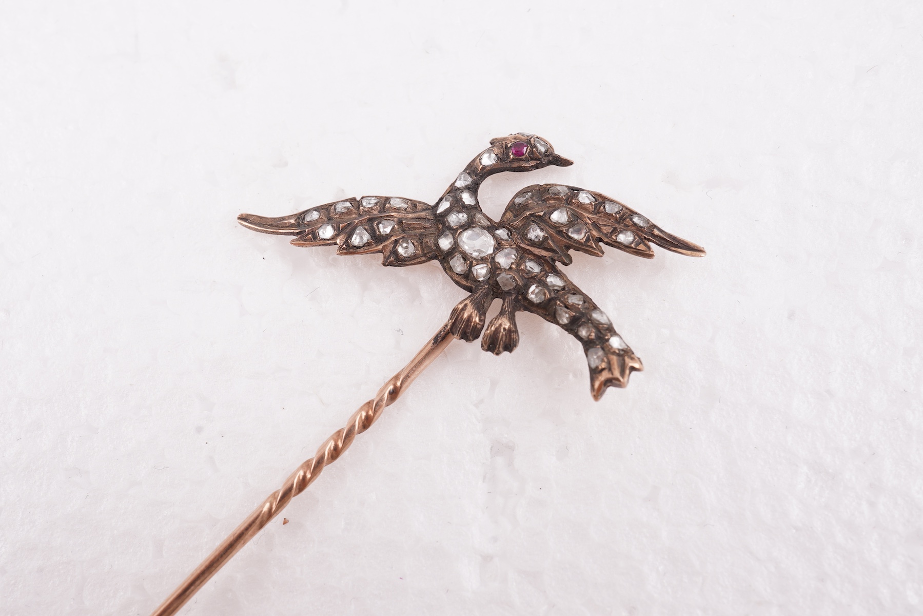 A diamond and ruby stick pin, designed as a bird in flight, set with rose-cut diamonds and a ruby eye, mounted in silver and gold, length 6.5cm, gross weight approximately 2.7 grams, case stamped SJ Phillips