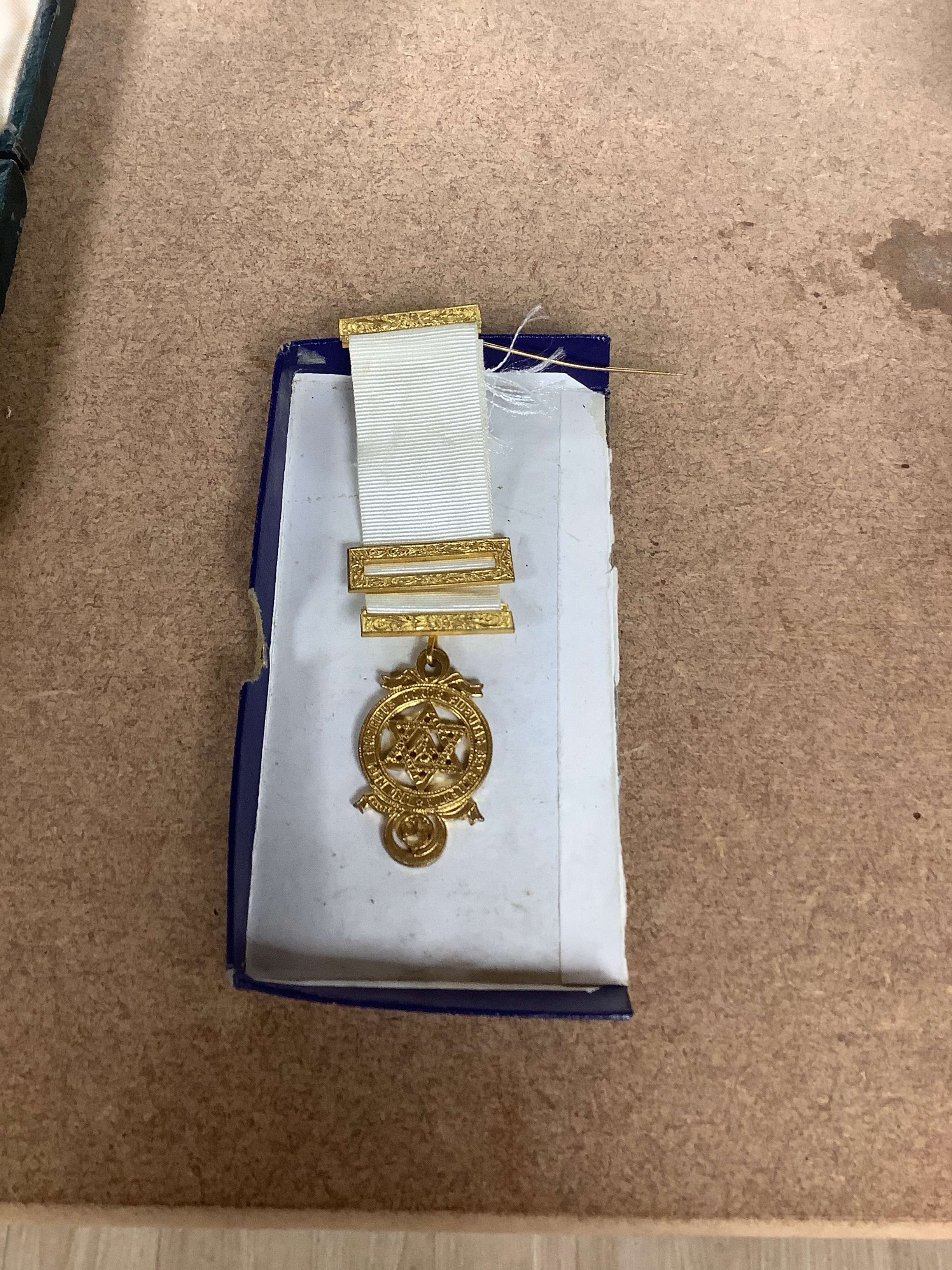 Lot 1217 , A Masonic silver-gilt and enamel medal, and four other civilian medals, Masonic medal 13cm overall