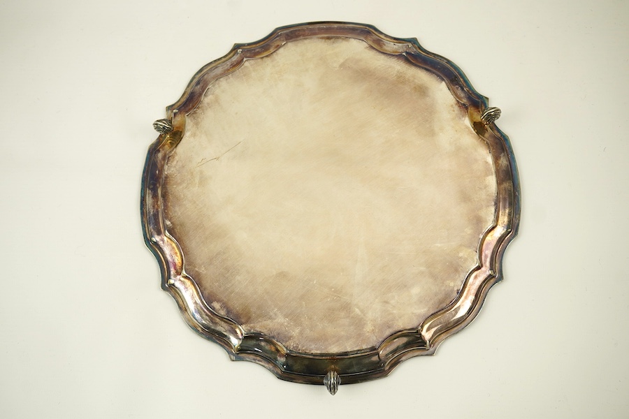 An Elizabeth II silver salver, maker BD, of shaped circular form, on three scroll feet, Sheffield, 1967, diameter 25.3cm, 14.7oz.