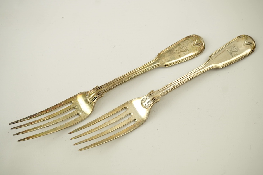 A matched set of six Victorian silver double struck fiddle and thread pattern dessert forks, by Elizabeth Eaton (5) London, 1846 and William Robert Smily (1), London, 1850, with engraved crest, 10.8oz.