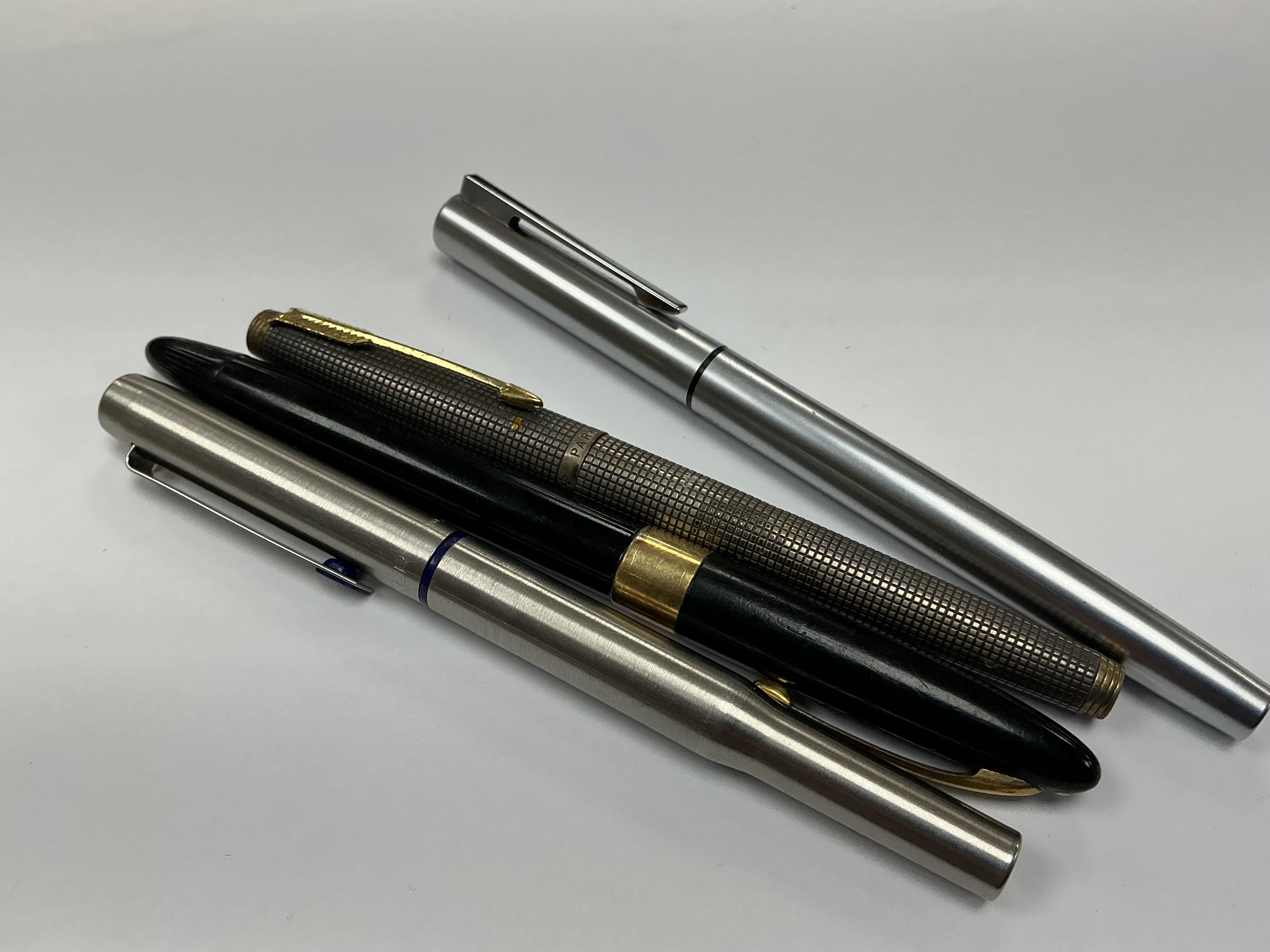 Two Parker fountain pens including sterling silver, a Sheaffer's fountain pen with 14k nib and a Waterman fountain pen.