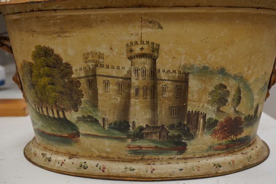A Victorian painted Toleware wine cooler hand painted with a moated castle and landscape, 50cm wide