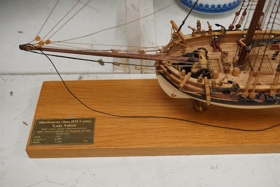 A wooden model boat, Sherbourne Class HM Cutter, 'Lady Nelson', on plinth 53cm wide