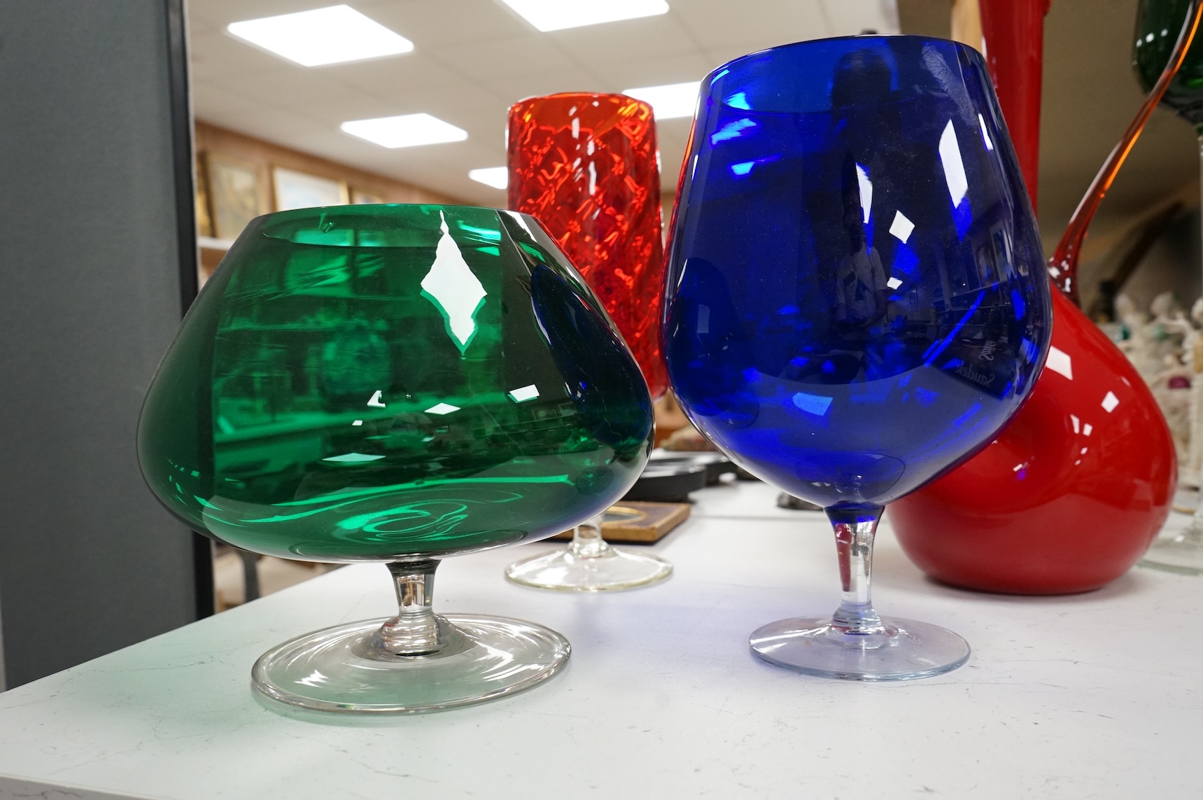 Lot 1177 , Four pieces of mid-century coloured glassware, to include a jug and an oversized brandy balloon, largest 48cm high