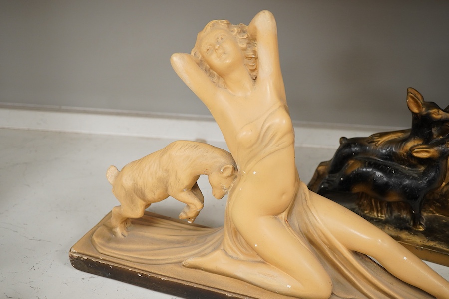 Two Art Deco style plaster figures to include a figure group of a lady and deer, largest 60cm wide