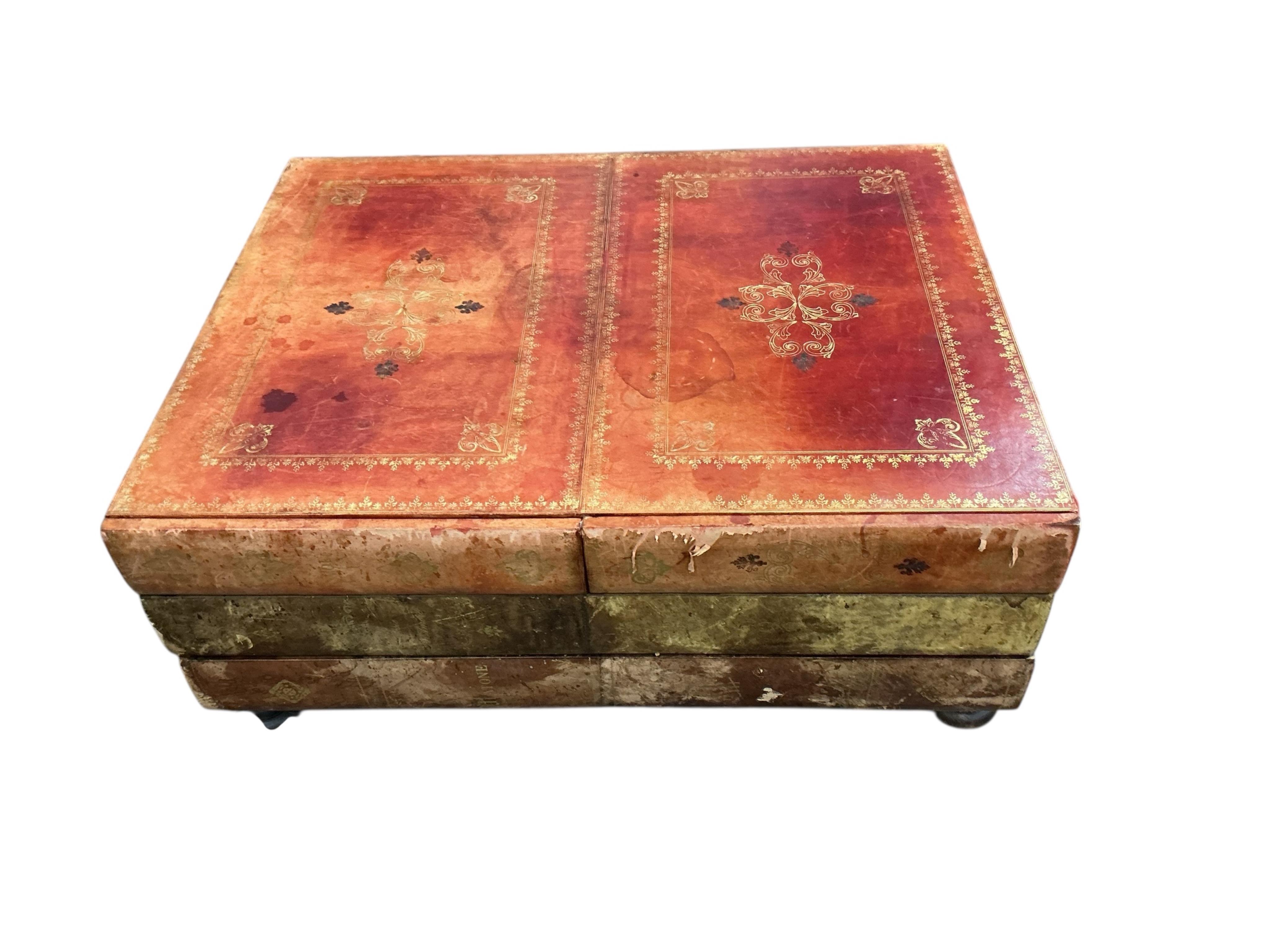 Lot 1437 , A gilt tooled leather covered three drawer coffee table modelled as a stack of books, width 90cm, depth 70cm, height 41cm