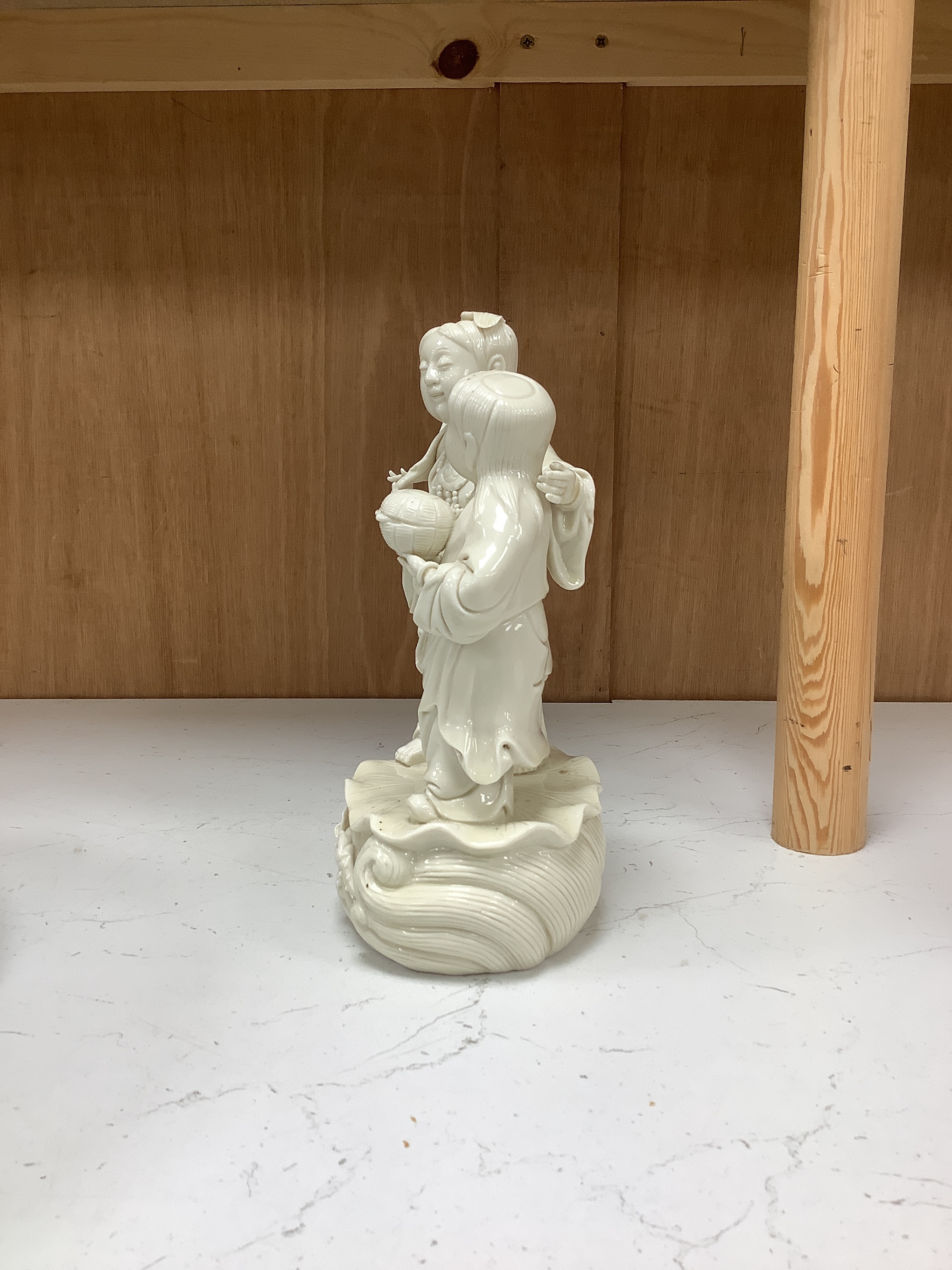 A Chinese blanc de chine group of Hehe Erxian, 24cm high
