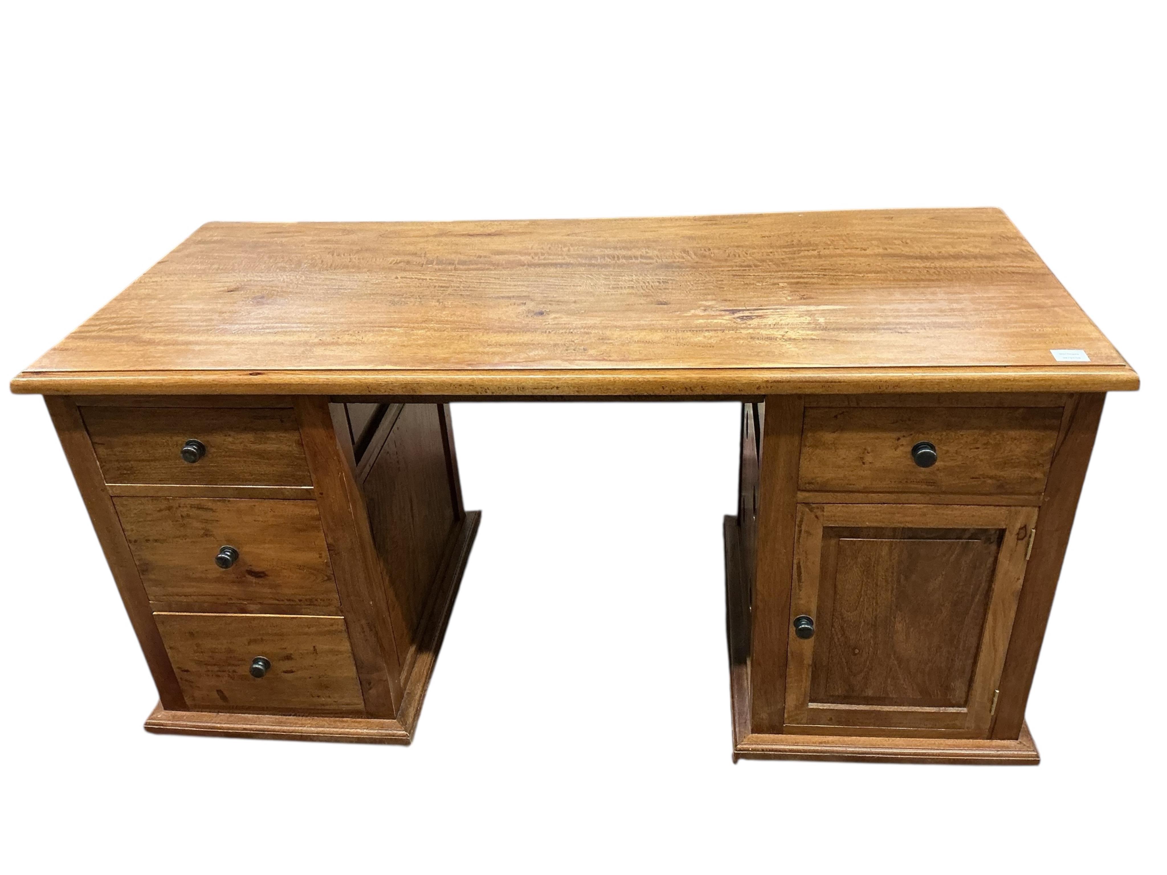 A hardwood pedestal desk, width 150cm, depth 65cm, height 76cm