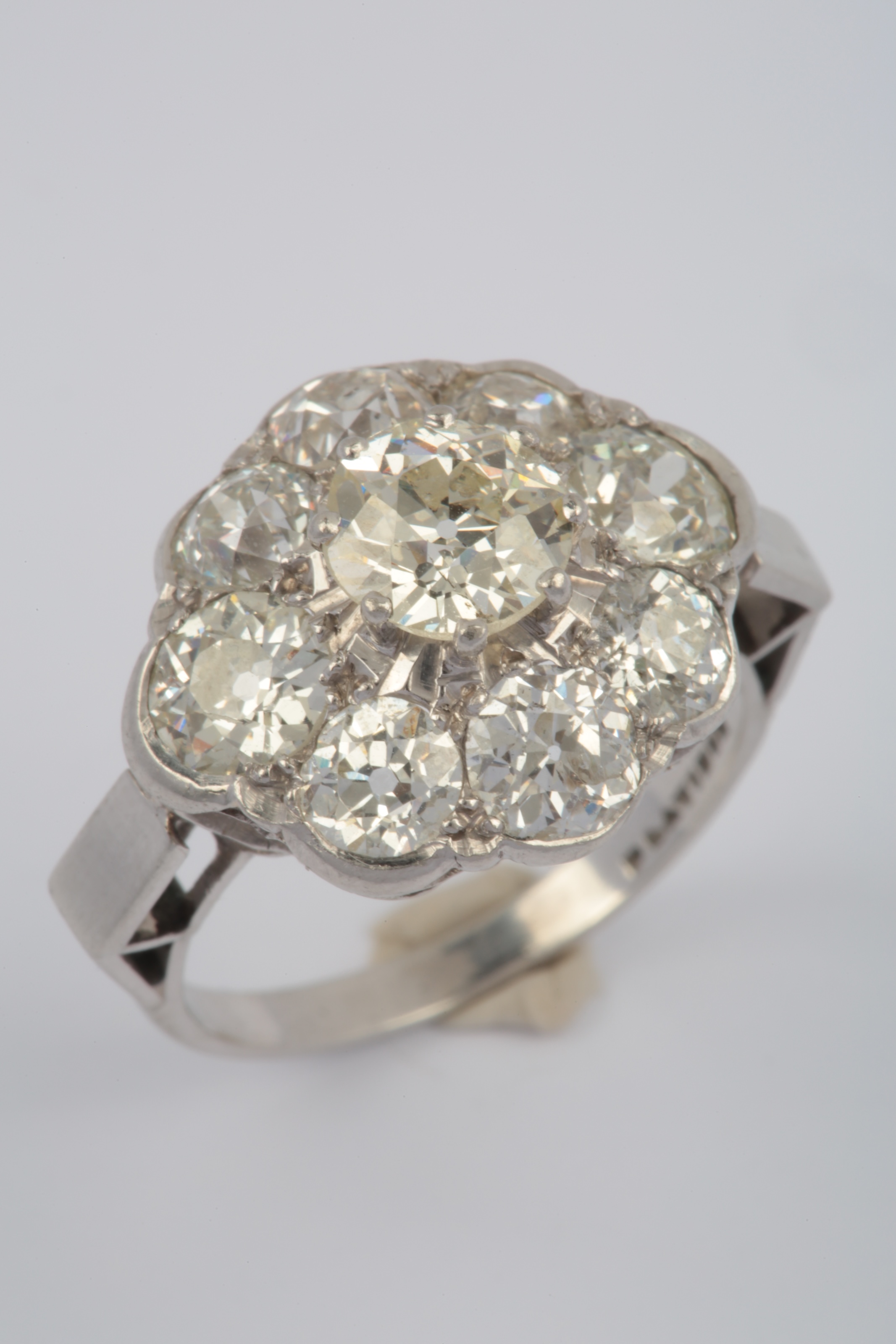 A diamond cluster ring, 1930s, set with circular-cut diamonds totalling approximately 3.50 carats, mounted in platinum, size M1/2, stamped PLATINUM, gross weight approximately 6.5 grams