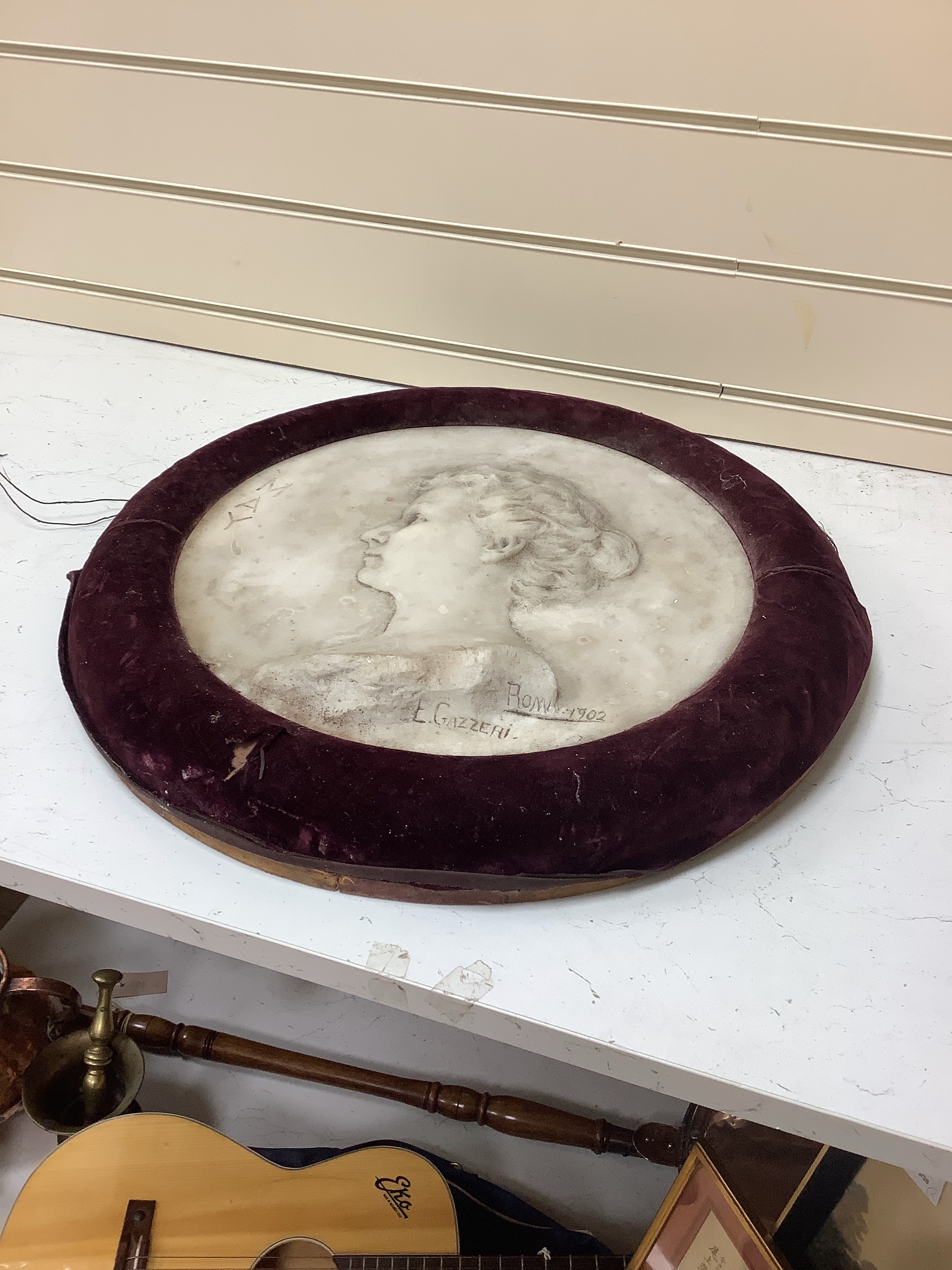 Ernesto Ermete Gazzeri (Italian, 1866-1965), a marble tondo portrait bust, ‘May’, signed, dated 1902 and inscribed Roma, housed a period velvet frame, overall 50cm in diameter