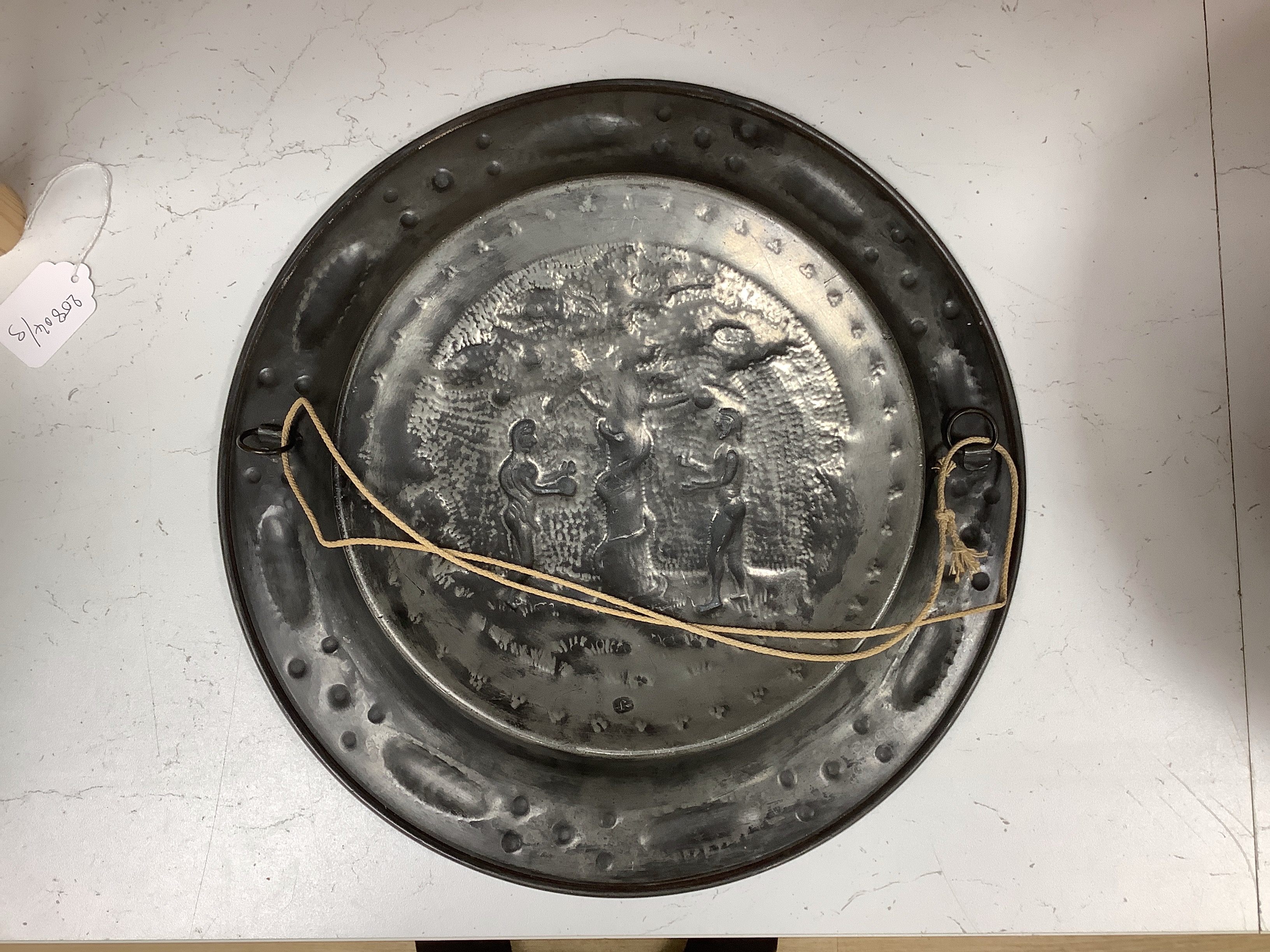 A North European pewter alms dish, decorated in relief with Adam and Eve, 40cm in diameter
