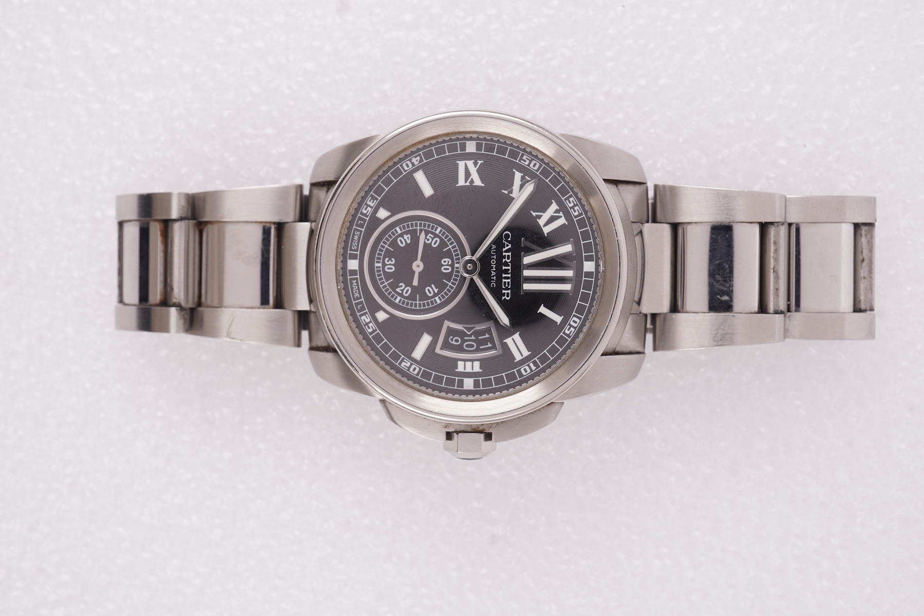A gentleman's 2011 stainless steel Calibre de Cartier automatic wrist watch, ref.3389, on a stainless steel Cartier bracelet, with black Roman dial, subsidiary seconds at 6 o'clock, date aperture and sapphire set winding crown, the case back numbered 508399RX, case diameter 40mm, with original Cartier box, certificate, spare links and booklets and a 2015 service receipt.
