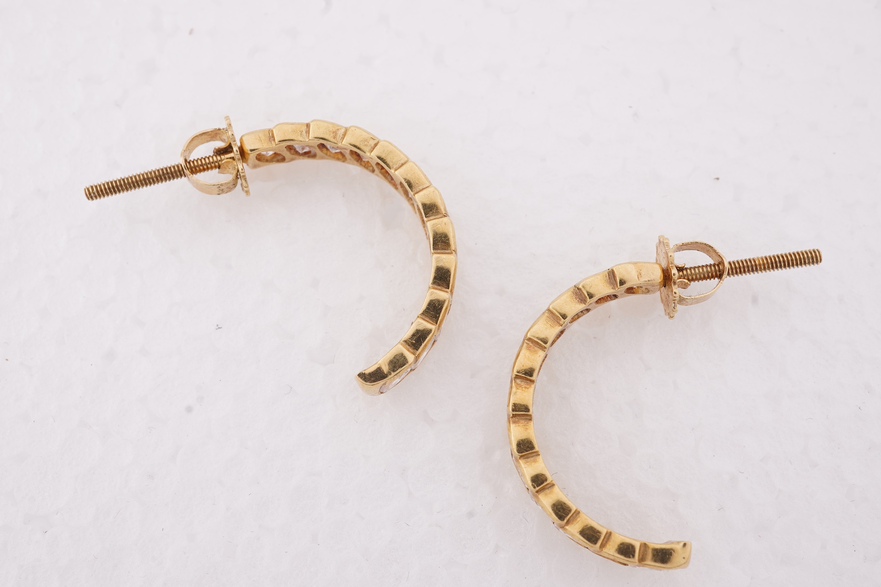 A pair of diamond earrings, designed as a half hoops set with marquise-shaped diamonds totalling approximately 1.60 carats, mounted in gold, length 2.1cm each, post fittings with screw threads, fittings stamped 18 CARAT GOLD, combined gross weight approximately 4.5 grams