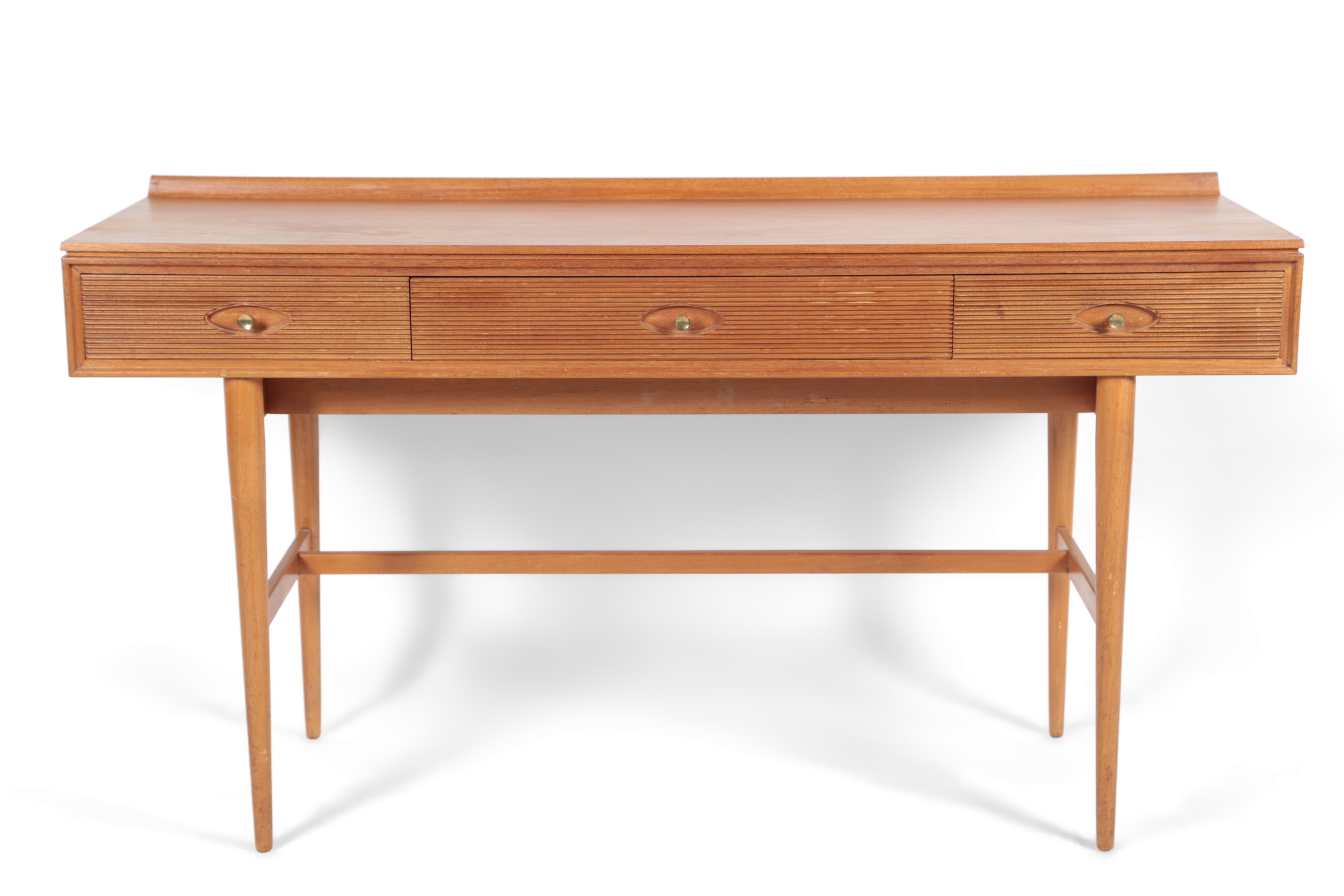 Robert Heritage (1927-2008) for Archie Shine: A 'Hamilton' teak console table, the rectangular top above three fluted frieze drawers with trumpet-shaped brass handles raised on tapering legs and connected by an H-stretcher, manufacturer's label to the reverse, 72.8cm high x 137cm wide x 45.4cm deep