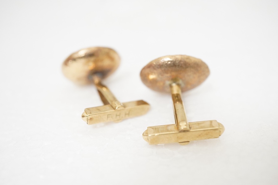 A pair of yellow metal oval cufflinks, with samorodok style decoration.