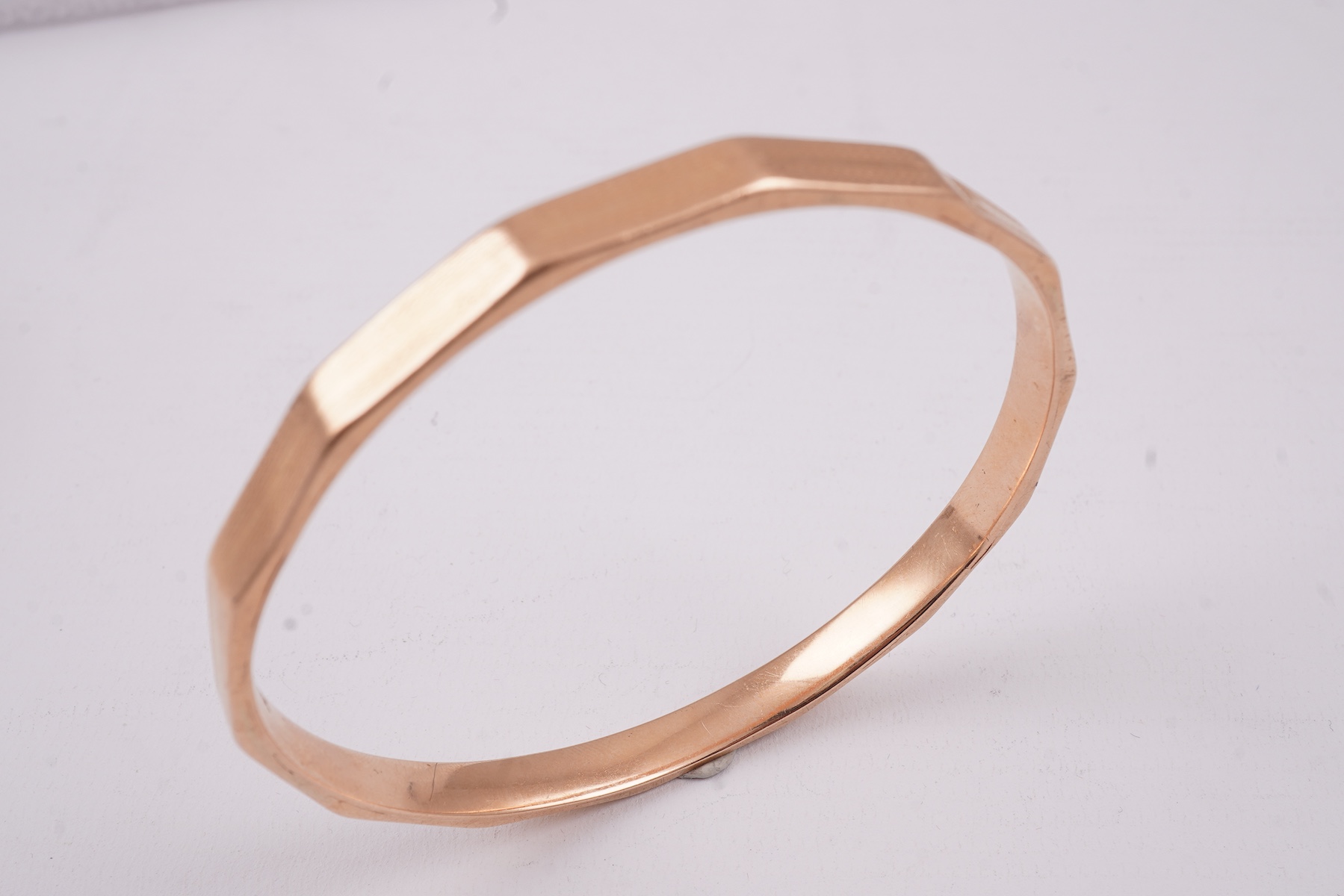 A gold bangle, early 20th century, designed as a faceted hoop with engraved decoration, inner circumference approximately 22.3cm, width 6.3mm, stamped 15CT, maker's mark PPLd, gross weight approximately 19.8 grams
