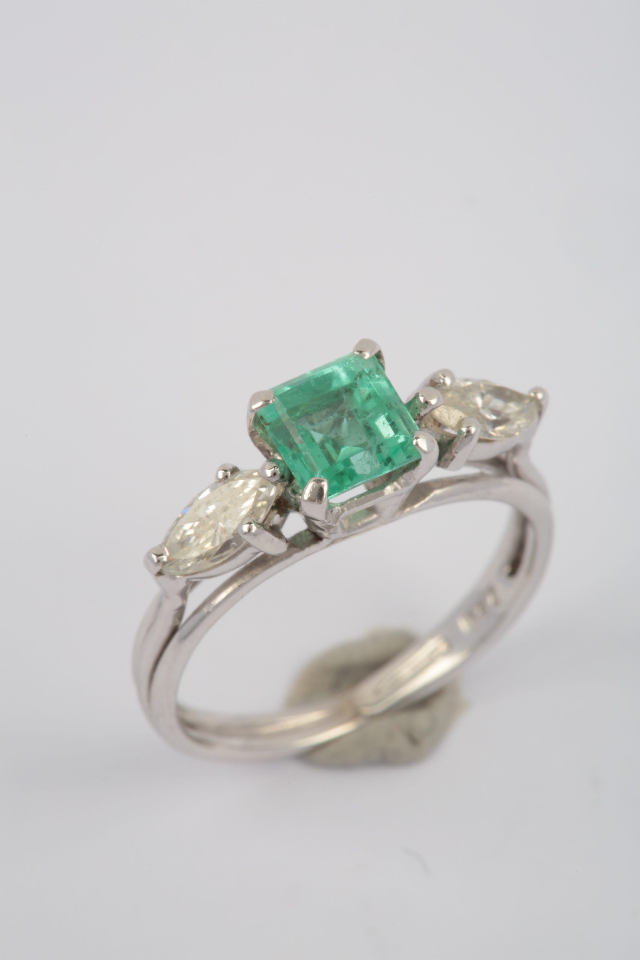 An emerald and diamond ring, claw-set with a step-cut emerald weighing approximately 0.50 carats, to shoulders set with marquise-shaped diamonds totalling approximately 0.20 carats, mounted in white gold, size G, stamped 750, gross weight approximately 2.5 grams