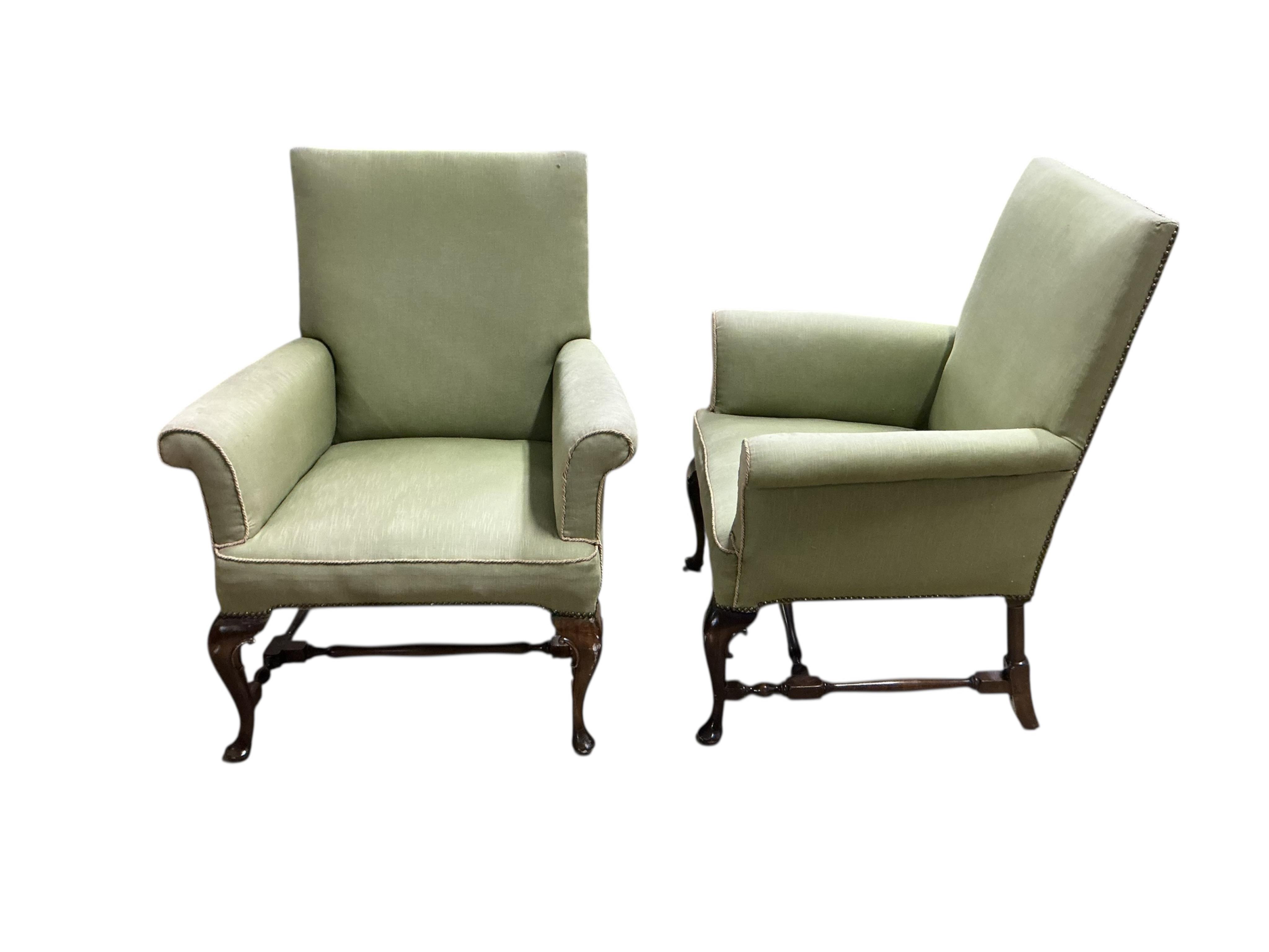 A pair of George I style upholstered armchairs, width 80cm, depth 60cm, height 100cm