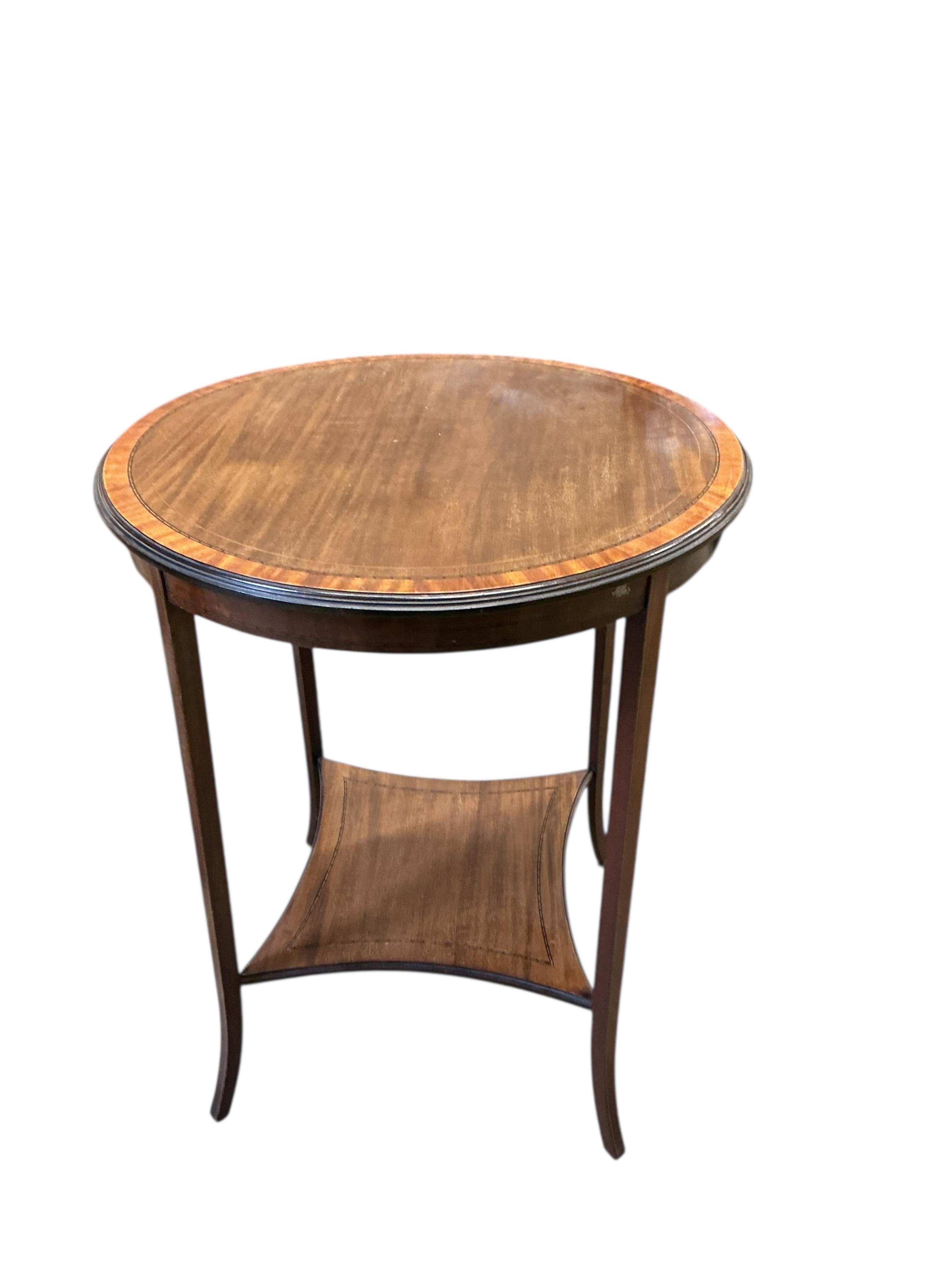 Lot 153 , An Edwardian inlaid mahogany two tier table, diameter 61cm, height 71cm together with two jardiniere stands