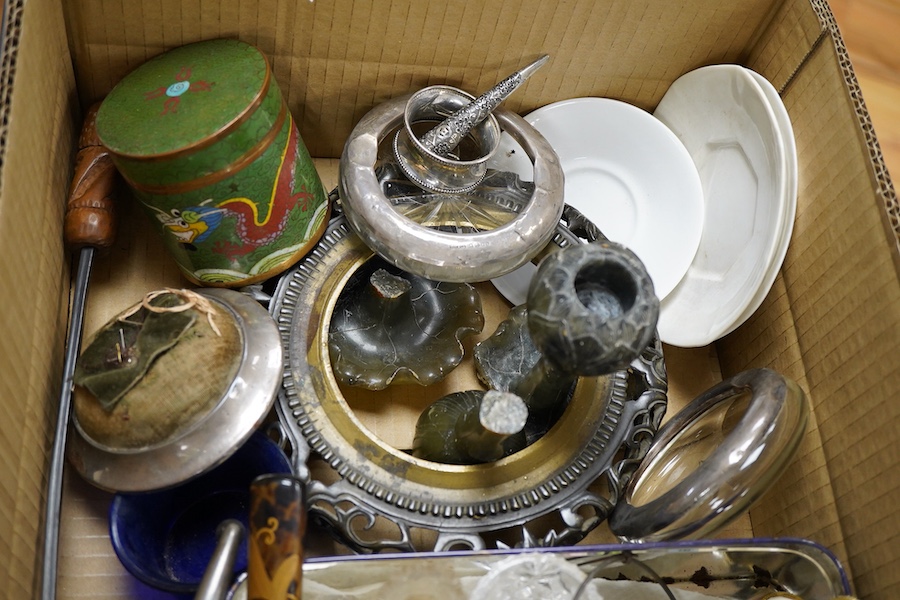 A collection of sundry items to include a Japanese tobacco pipe, a Chinese silver nail guard and a cloisonné pot and cover