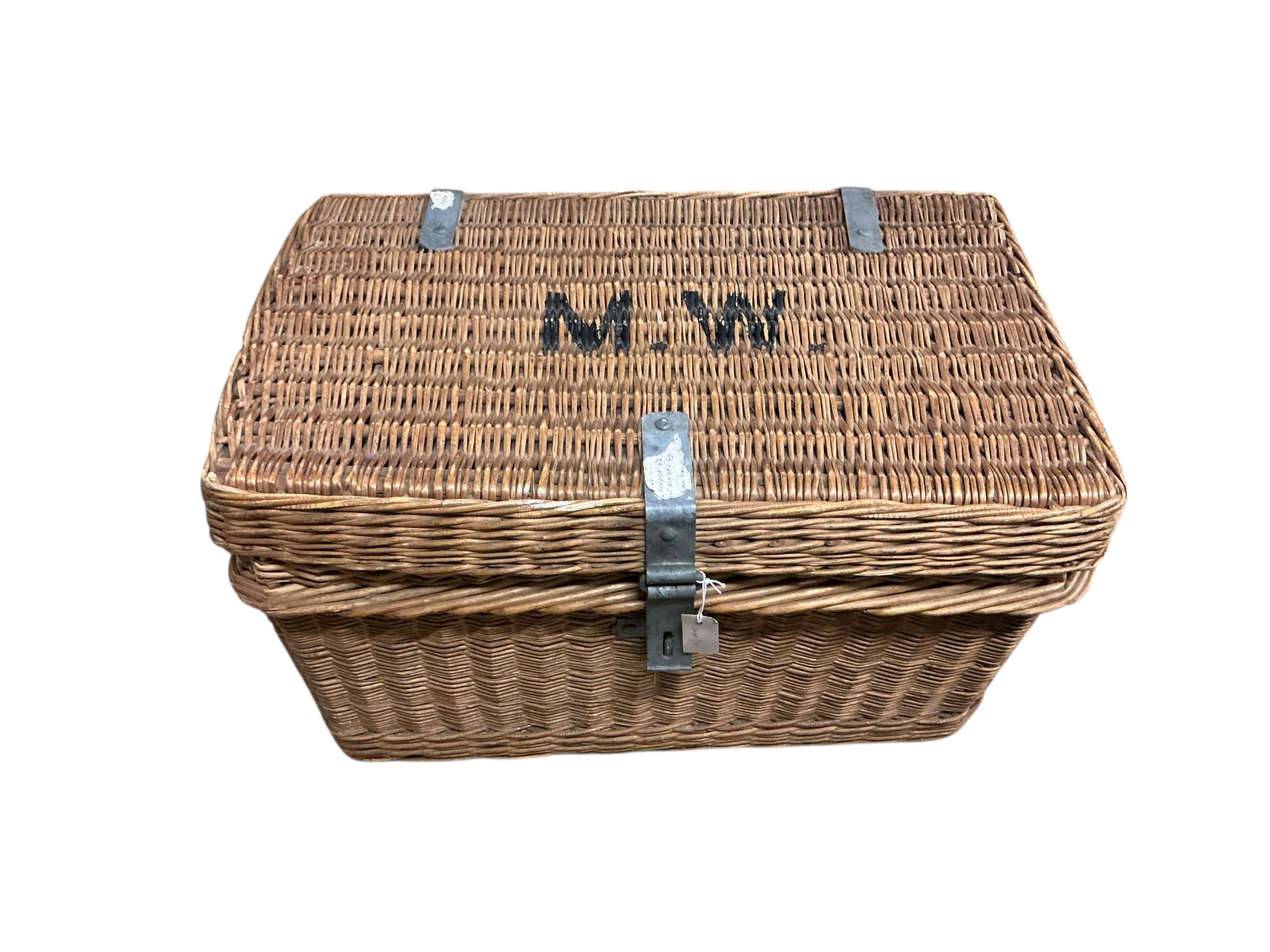 Lot 129 , A vintage zinc mounted wicker laundry hamper, width 84cm, depth 53cm, height 52cm