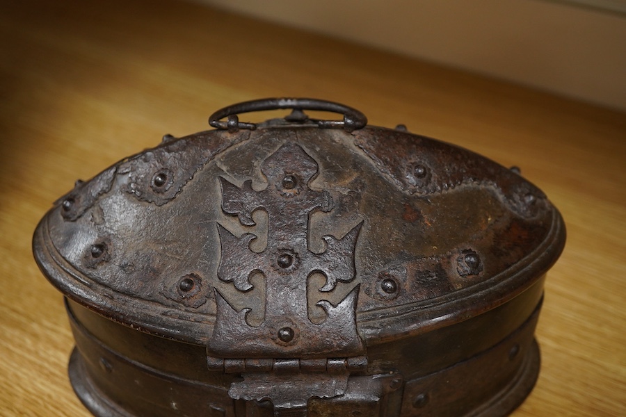 An 18th century wood and iron-bound relic box with domed hinged lid, 21cm wide